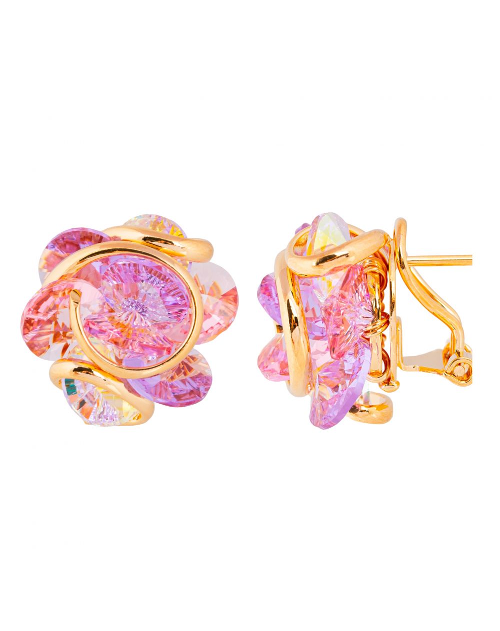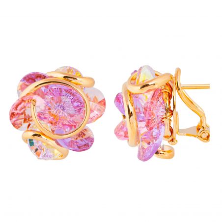 Elke oorbel bestaat uit een set Swarovski®-kristallen met lila, roze en gouden reflecties , zorgvuldig gerangschikt om een lichtgevende bloem te vormen, zoals een gestileerde ninfea (waterlelie). Het geheel is delicaat verweven met een 24-karaats vergulde draad , die een cirkelvormige beweging van grote harmonie vormt.