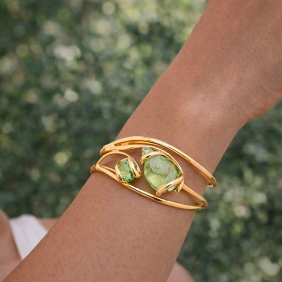 Elegant en uitgesproken eigentijds: de Andrea Marazzini Venice Deluxe Peridot GIO2 armband betovert met zijn sculpturale ontwerp en de uitzonderlijke schittering van de kristallen. Deze verfijnde creatie combineert twee Swarovski®-kristallen in peridotgroene tinten, subtiel gezet in een gouden structuur met vloeiende en artistieke lijnen.