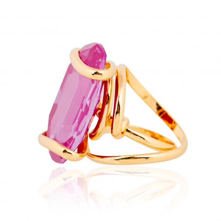 Deze ring onderscheidt zich door zijn ovale Swarovski®-kristal van 28 mm , met een intense en heldere ciclamin-tint, die het licht op een opmerkelijke diepte weerkaatst.