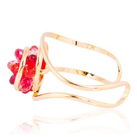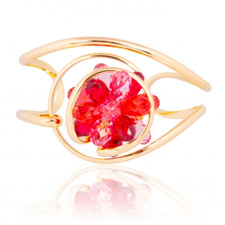 Het goudkleurige metalen frame, met zijn vloeiende en luchtige lijnen, omsluit het kristal op subtiele wijze en benadrukt de uitzonderlijke schittering ervan. Dankzij de open en verstelbare armband past dit sieraad zich op natuurlijke wijze aan elke pols aan en biedt het elke dag optimaal draagcomfort.