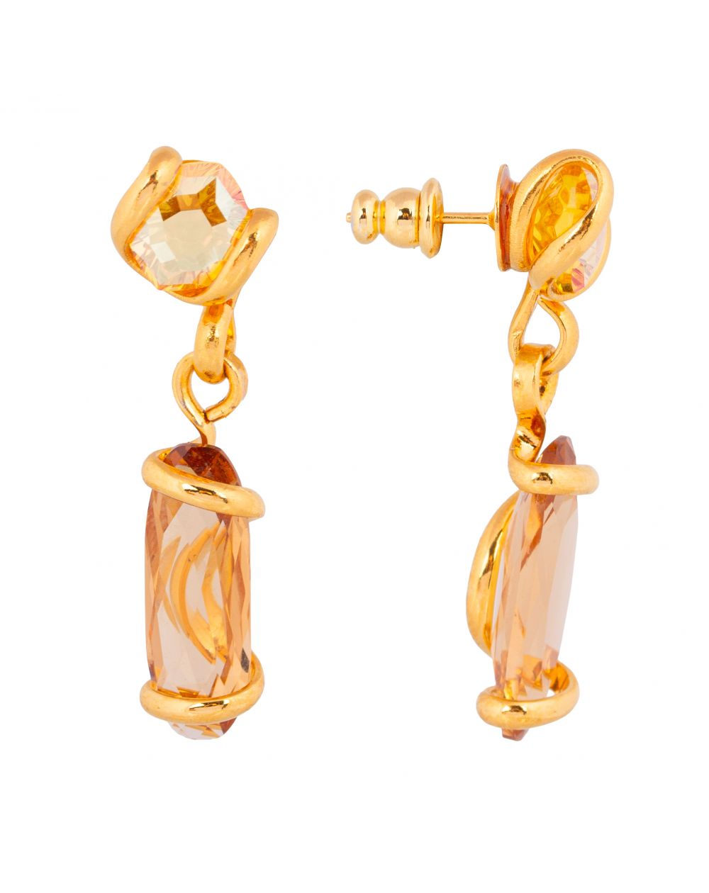 Deze oorbellen, vervaardigd uit Swarovski-kristallen met gouden en iriserende reflecties , spelen met het licht dankzij een subtiel gearticuleerde dubbele hangerstructuur. Het bovenste kristal trekt de aandacht, terwijl het langwerpige kristal een vloeiende en verfijnde beweging aan elk gebaar toevoegt.