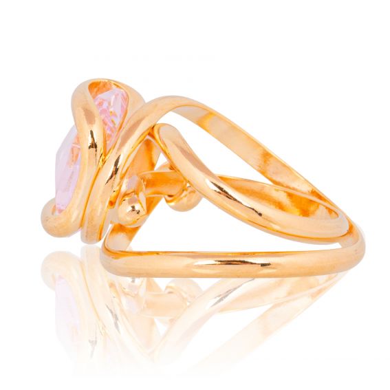 De gouden zetting, met zijn vloeiende en omhullende rondingen, benadrukt de geometrie van de steen en voegt tegelijkertijd een kenmerkende artistieke toets toe van ontwerpster Andrea Marazzini. Het contrast tussen de warmte van het metaal en de roze transparantie van het kristal creëert een harmonieus en vrouwelijk sieraad.