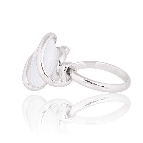 Het druppelvormige Swarovski®-kristal , met zijn opaalwitte reflecties, vangt het licht op subtiele wijze op en onthult licht melkachtige, iriserende nuances. Afhankelijk van de hoek krijgt de steen een bijna magische, parelmoerachtige zachtheid, die de hand een schitterende en verfijnde uitstraling geeft.