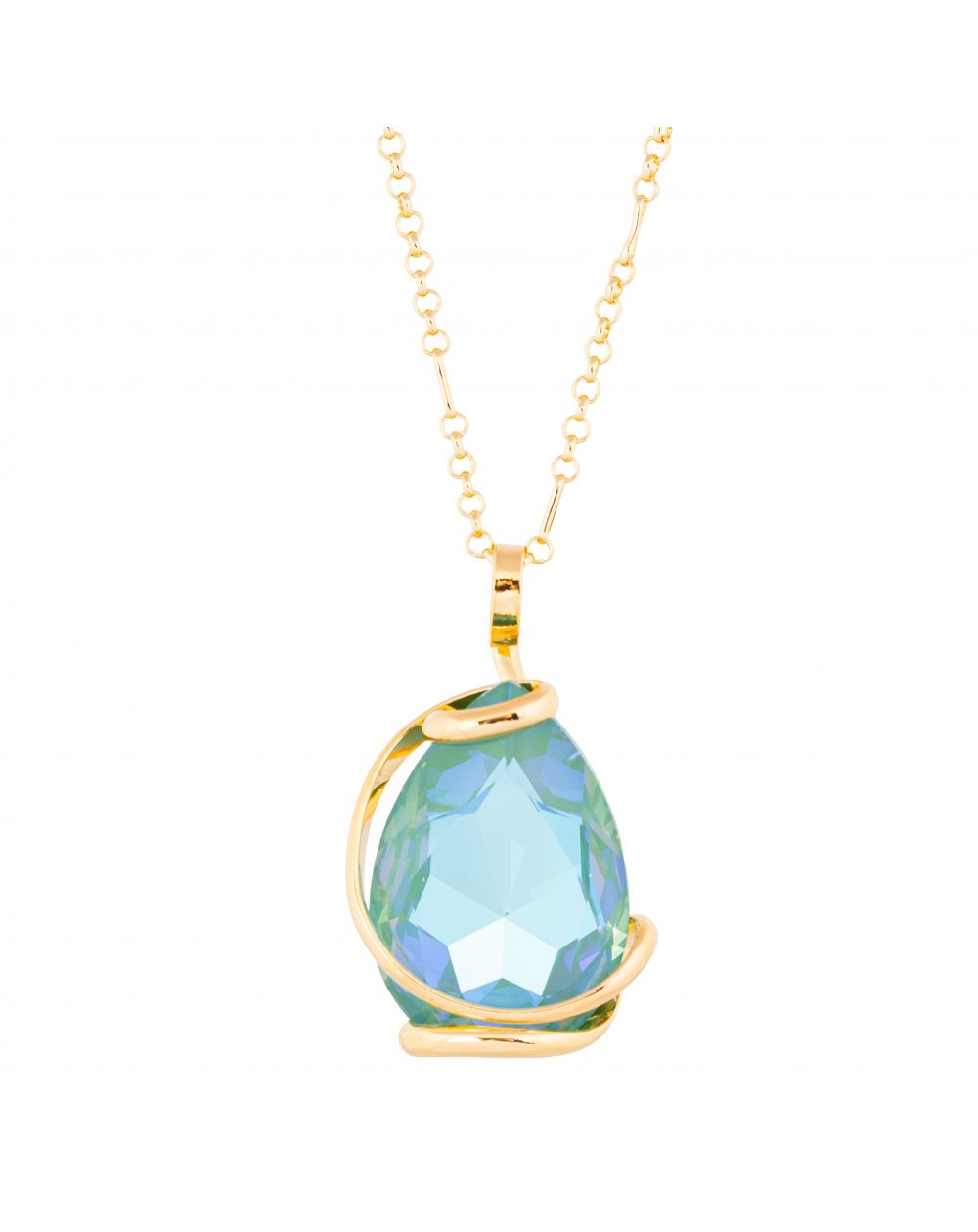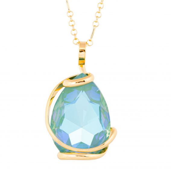 De hanger is voorzien van een weelderig peervormig Swarovski®-kristal , met laguneblauwe reflecties die turkoois, zeegroen en iriserende glitters combineren. Afhankelijk van de lichtinval onthult de steen een fascinerende diepte, die doet denken aan het kristalheldere water van een lagune.