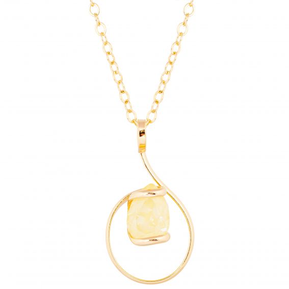 Het kenmerkende goudkleurige frame omarmt het kristal in een vloeiende, organische beweging, zwevend in het midden van een delicate cirkel die het silhouet een lichte en moderne uitstraling geeft. Het algehele effect creëert een perfecte balans tussen minimalisme en schittering.