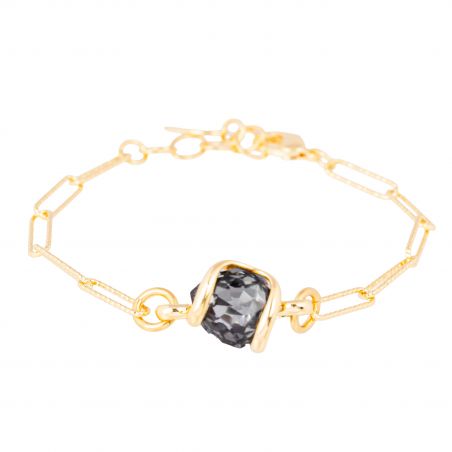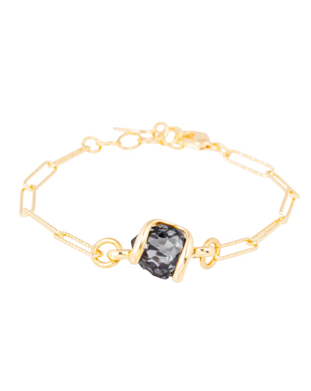 In het midden van de armband vangt een kussenvormig Swarovski®-kristal in een diepgrijze tint op subtiele wijze het licht. De kenmerkende gouden zetting omarmt de steen in een vloeiende, organische beweging, waardoor de schittering ervan wordt benadrukt en tegelijkertijd een minimalistische stijl behouden blijft.