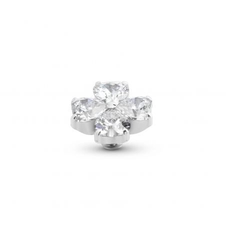 Deze klavertjevier, een symbool van liefde en geluk, bestaat uit vier hartvormige zirkonia's. Verkrijgbaar in zilver, goud of roségoud, en compatibel met alle Melano Twisted sieraden.