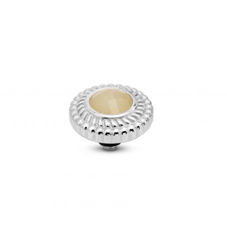 Laat u betoveren door de Melano Twisted Glorious edelsteen , een stralende creatie met een rijk en verfijnd ontwerp . De gefacetteerde glazen steen vangt het licht prachtig op , terwijl de dubbele stalen zetting de glans versterkt : een elegante touwstructuur gecombineerd met Melano 's iconische parelrand .