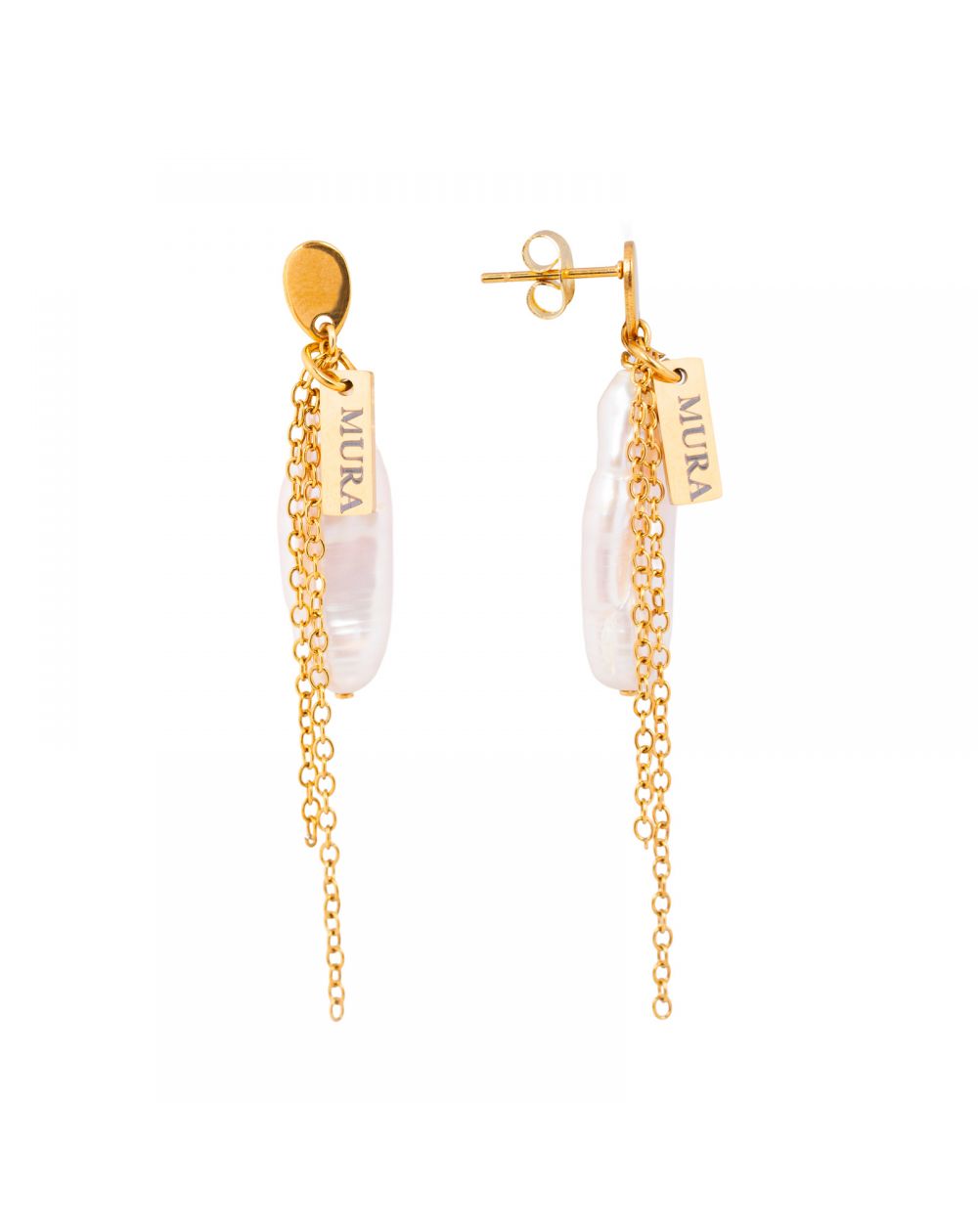 Deze oorbellen zijn vervaardigd uit een natuurlijke parel met een organische vorm , waardoor elk paar uniek is en delicate parelmoerachtige nuances onthult. De fijne, beweeglijke gouden kettinkjes zorgen voor een dynamische uitstraling en vangen het licht bij elke beweging, waardoor een visueel samenspel ontstaat dat zowel licht als verfijnd is.