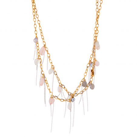 Dit sieraad, opgebouwd uit verschillende overlappende rijen, is versierd met kwarts, maansteen en labradoriet , waardoor een spel van zachte en stralende tinten ontstaat. De roze tinten van de kwarts, de parelmoerachtige reflecties van de maansteen en de fonkelende schittering van de labradoriet geven het geheel diepte en verfijning.