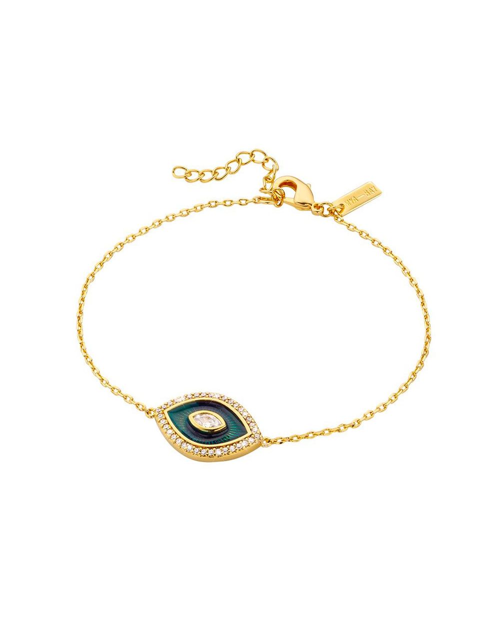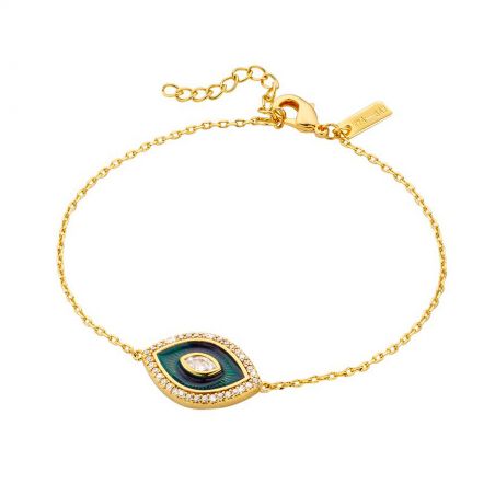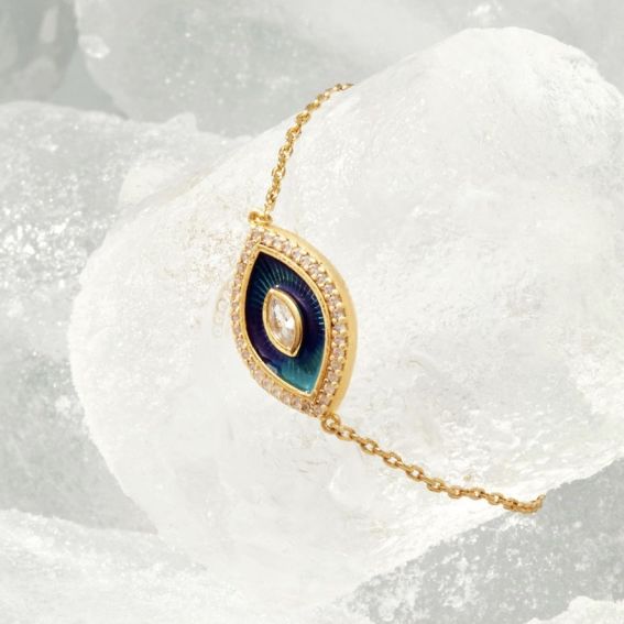Deze armband uit de " Bluetika "-collectie van MYABAY is ontworpen in verguld goud en heeft een charmante oogvormige hanger, die bescherming en inzicht symboliseert. Het oog wordt geaccentueerd door een spel van heldere kleuren met een blauwe geëmailleerde achtergrond, omringd door heldere zirkoniastenen voor een glinsterend effect. Dit sieraad combineert een aantrekkelijke esthetiek met sterke symboliek, waardoor het zowel een modeaccessoire als een talisman van geluk is.