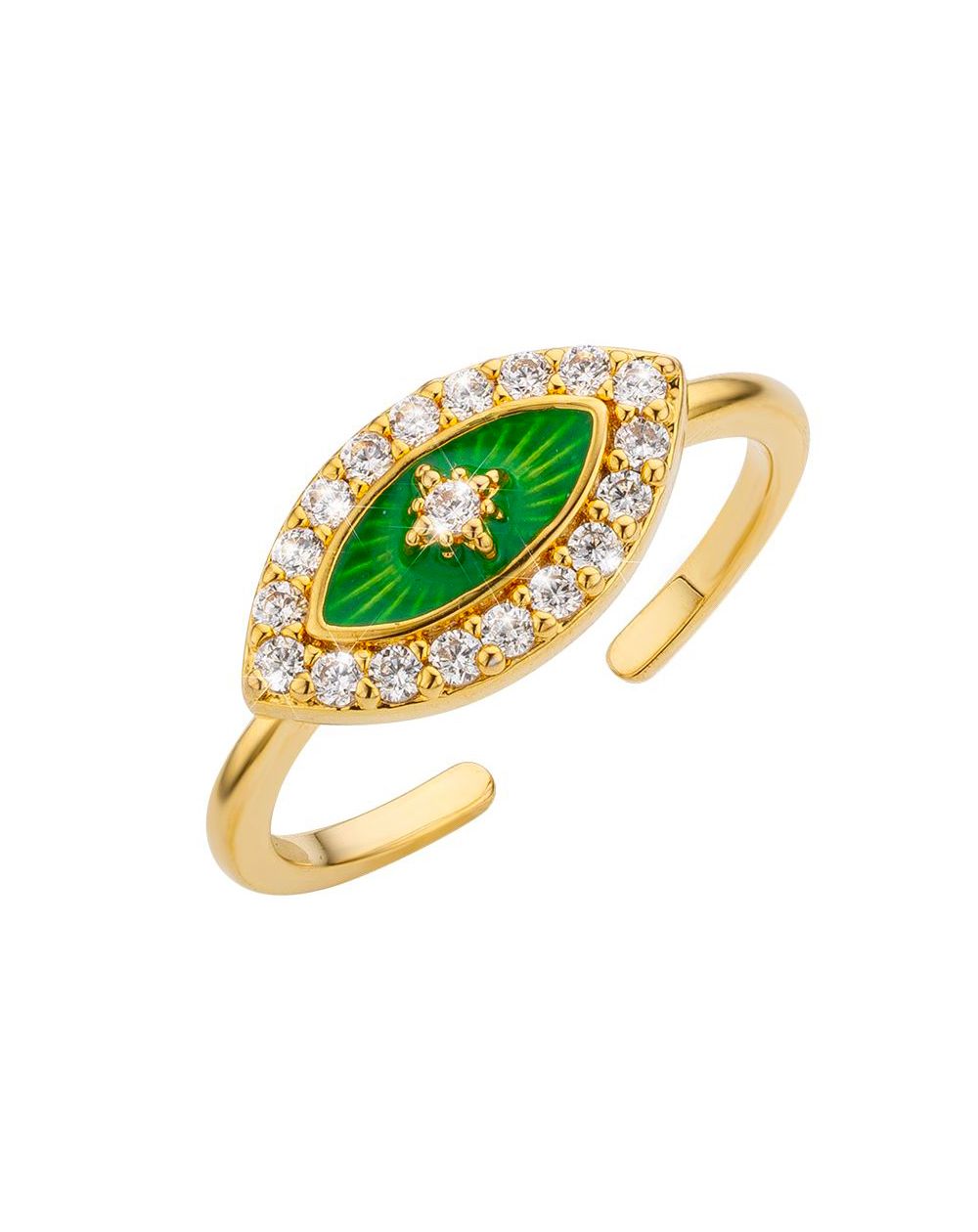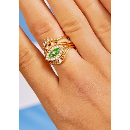Deze Mya Bay- ring is versierd met een oogvormige steen met groene reflecties, gezet in verguld goud. Omringd door glanzende zirkonia's, biedt dit stuk een glamoureuze en trendy look. Het is ideaal om een vleugje sprankeling toe te voegen aan elke outfit, dagelijks of 's avonds.