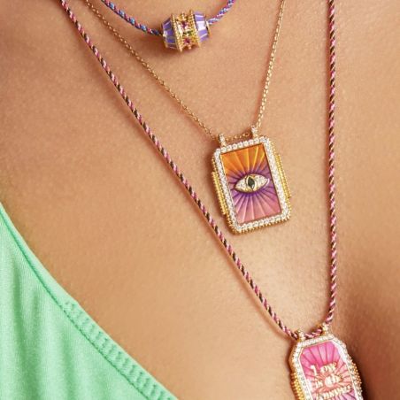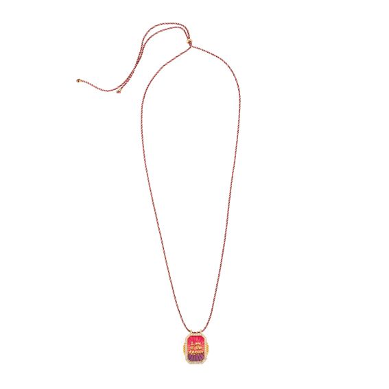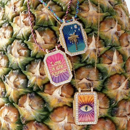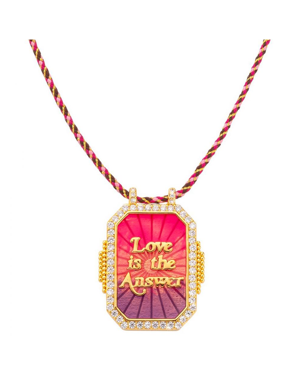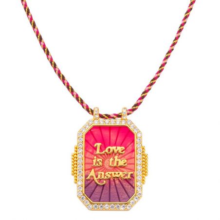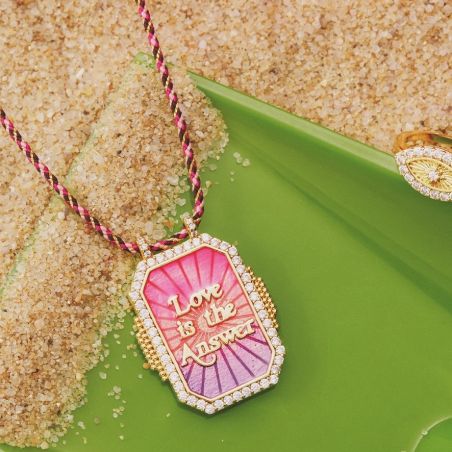Deze Mya Bay -ketting heeft een opvallende, kleurrijke hanger met 'Love is the Answer' gegraveerd in gouden letters op een rode en paarse achtergrond. De hanger is omlijst met goud en versierd met zirkonia voor extra sprankeling. Dit sieraad, gedragen door een gevlochten ketting die afwisselt tussen tinten roze en goud, is zowel levendig als inspirerend, perfect voor degenen die een vleugje kleur en positiviteit aan hun garderobe willen toevoegen.