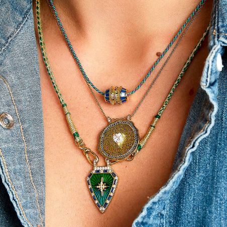 De hanger die je hebt gedeeld heeft een uniek en opvallend ontwerp. Het heeft de vorm van een schild met een gouden ster in het midden, die licht en bescherming symboliseert. De hanger is versierd met blauwe en groene stenen gerangschikt in stralen, wat een helder en dynamisch effect aan de sieraden geeft. De rand is ook versierd met kleine kristallen, wat de algehele schittering van het stuk versterkt. De hanger hangt aan een groen en goud gevlochten koordketting, wat de sieraden een bohemien en ambachtelijk tintje geeft.
