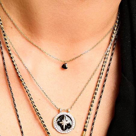 De hanger die je hebt gedeeld heeft een minimalistisch en elegant ontwerp. Het bestaat uit een dunne gouden ketting, met als hoogtepunt een klein hartje in transparant ZWART kristal. Het hartvormige kristal, subtiel opgehangen, geeft een vleugje verfijning en eenvoud aan dit juweel.