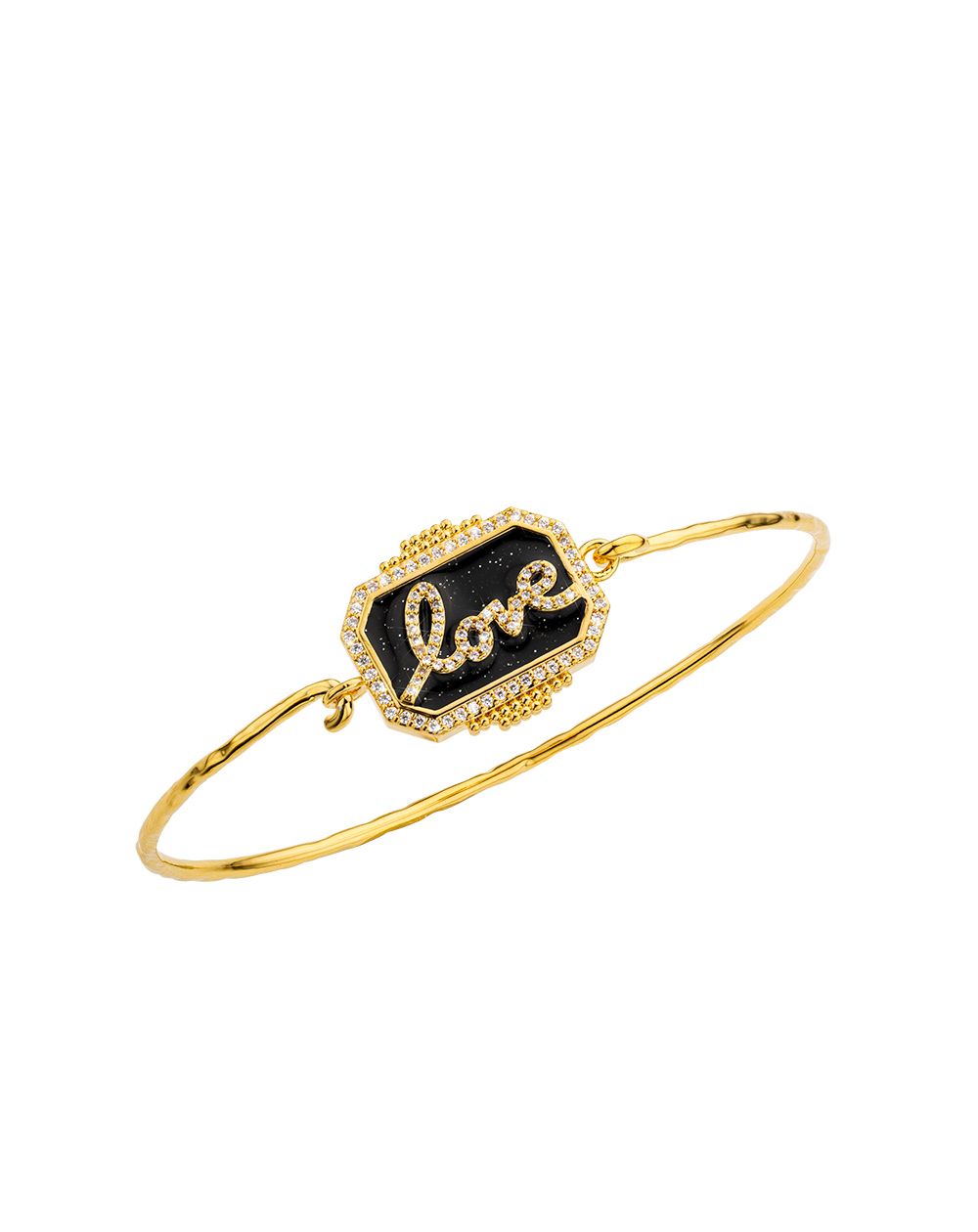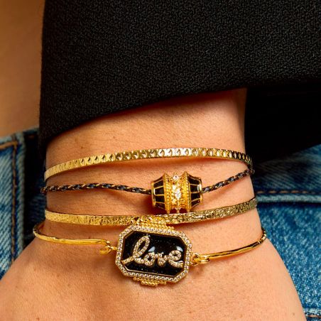 Geef je outfits een chique en bohemien tintje met de Black Shiny Love Bohème- armband van MYA BAY , een iconisch stuk verguld met 24-karaats gerecycled goud. Dit verfijnde sieraad onderscheidt zich door zijn glanzende zwarte emaille, versierd met delicate pailletten die het licht opvangen, en zijn inspirerende inscriptie ‘Love’.