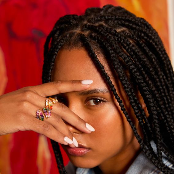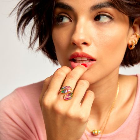 De Rainbow Leaves -ring combineert natuur en glamour met zijn roze en paarse tinten. Verguld met 24-karaats gerecycled goud, is het verstelbare ontwerp geschikt voor alle maten.