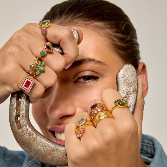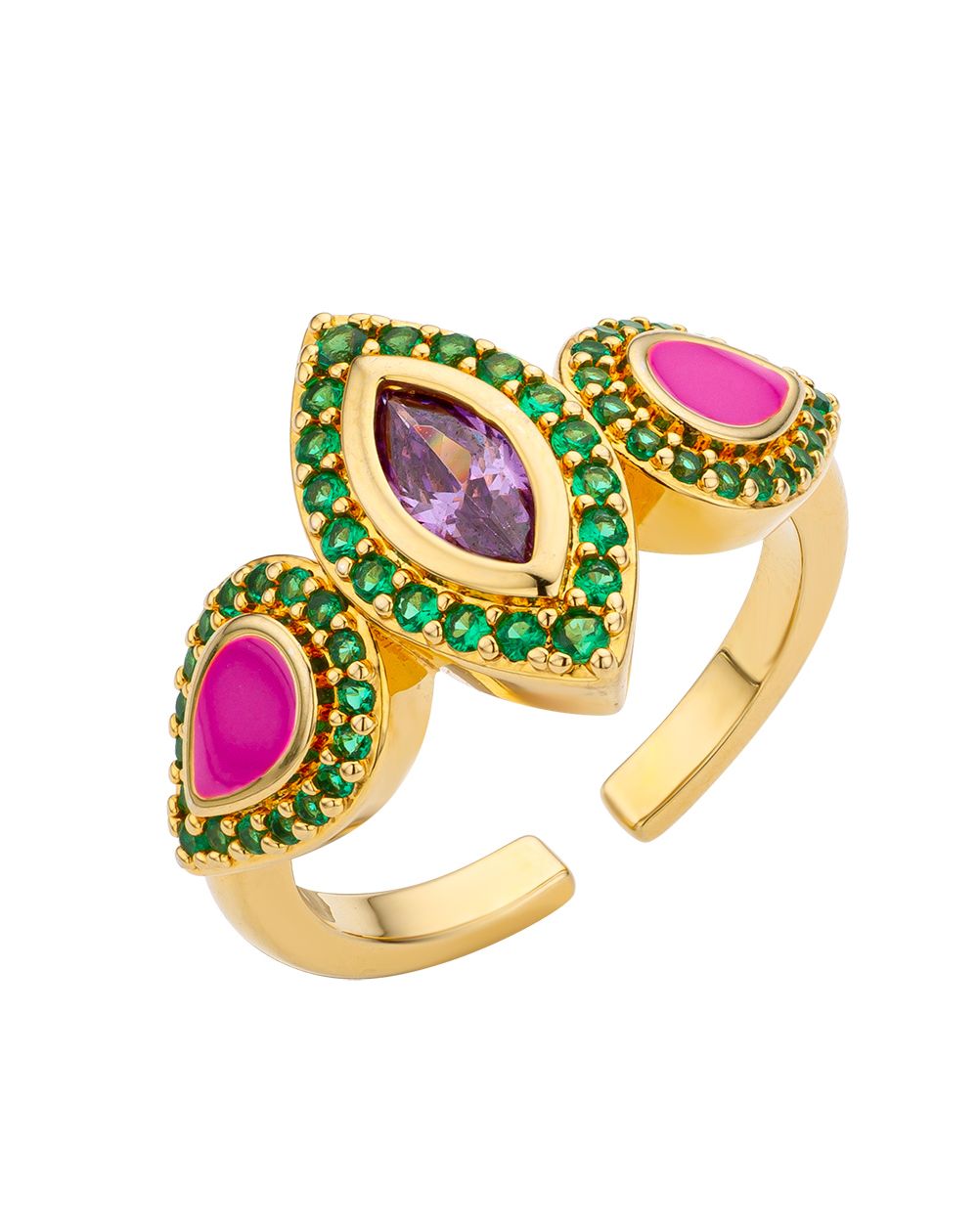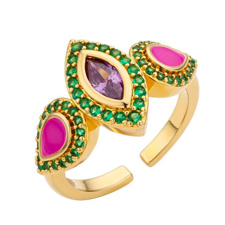 De FUCHSIA LOVELY MADEMOISELLE ring van MYA—BAY is een heruitgave van het MADEMOISELLE model in een grotere, assertievere versie. Verguld met 24-karaats gerecycled fijngoud en versierd met een levendig fuchsiakleurig emaille, is het geïnspireerd op de levendige kleuren van cactusbloemen. Het is gedurfder in volume, het trekt de aandacht en behoudt tegelijkertijd een natuurlijke zachtheid.