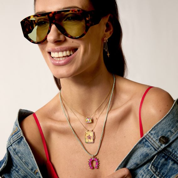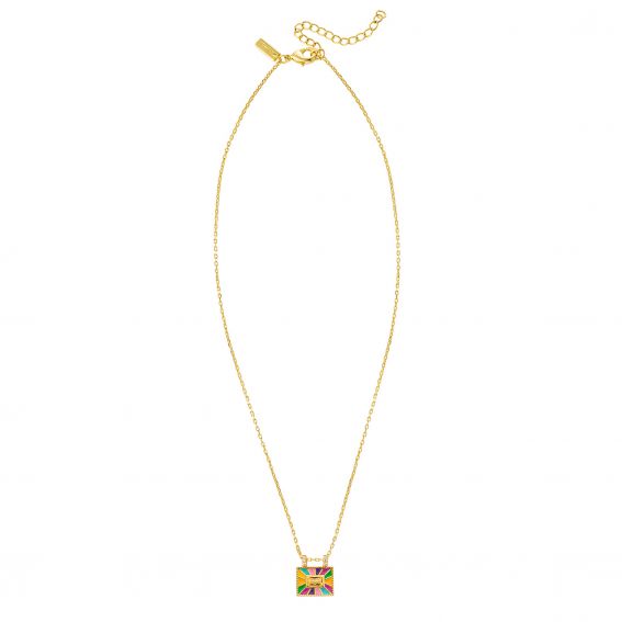 De RAINBOW EL PASO- ketting van MYA—BAY , verguld met 24-karaats gerecycled fijngoud, legt de magie van een zonsondergang in de woestijn van Texas vast met de rechthoekige, veelkleurige emaille hanger. Uitbundig en levendig, het geeft je look energie en stijl. Dankzij de verstelbare lengte van 38 cm + 5 cm ketting past hij zich aan al jouw draagwensen aan. Een sterk stuk, een symbool van goede humor en durf.