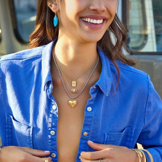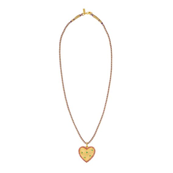 Voeg een vleugje oogverblindende fantasie toe aan je stijl met de BIG FUN HEART-ketting van MYA—BAY . Dit sieraad is gemaakt van 24-karaats gerecycled fijn goud en heeft een bolvormig, getextureerd hart, geïnspireerd op ons iconische GROTE HART. Het is bevestigd aan een felgekleurd koord en voorzien van een rand van sprankelende fuchsia strass-steentjes. Het vangt het licht en zorgt voor een stralend en sprankelend effect.