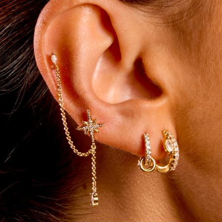 De Rock Delhi- oorbellen van Mya Bay zijn echte statement pieces in een miniformaat (13 mm), perfect om je look een vleugje sprankeling en rockstijl te geven. Deze elegante mini-oorbellen, verguld met 24-karaats fijn goud, zijn voorzien van een rij sprankelende witte stenen en een beweegbare hanger , eveneens bezet met stenen.