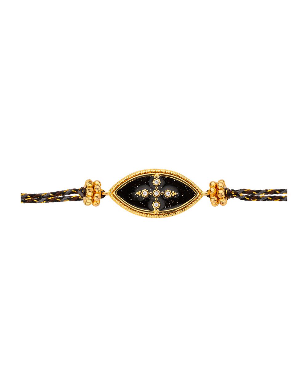De Black Chennai Iris van Mya Bay is een armband met een mystieke en verfijnde charme. Het gevlochten koord in zwart en goud accentueert een ovaal medaillon van 24-karaats fijngoud, versierd met een diepzwarte steen bezet met een lichtgevend patroon van witte zirkonia's.