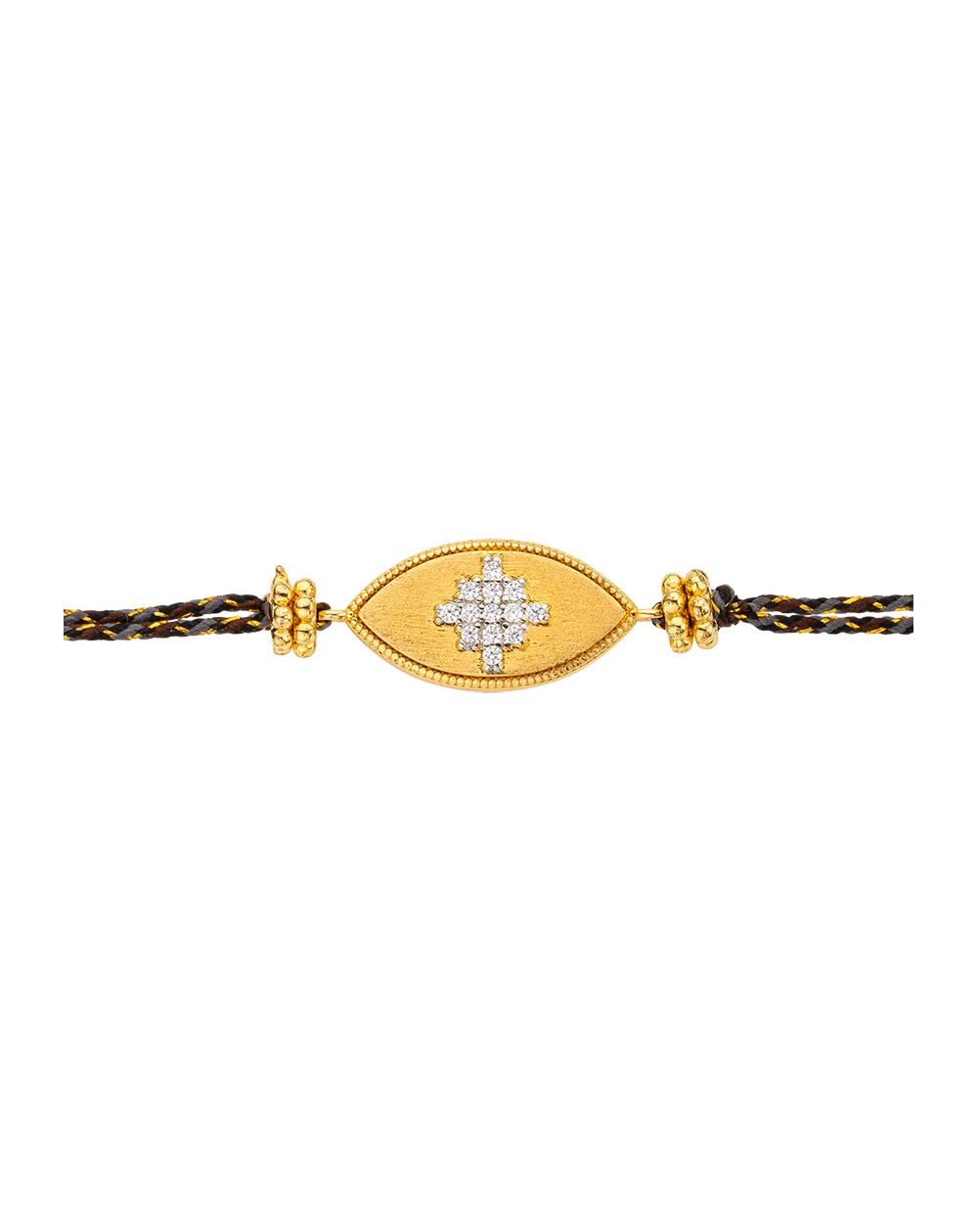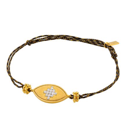 De Bella Iris van Mya Bay is een verfijnde armband die tijdloze elegantie en symboliek combineert. Hij is vervaardigd aan een zwart en goud gevlochten koord en heeft een ovaal medaillon van 24-karaats verguld goud, subtiel versierd met een glinsterend wit zirkonia kruis.