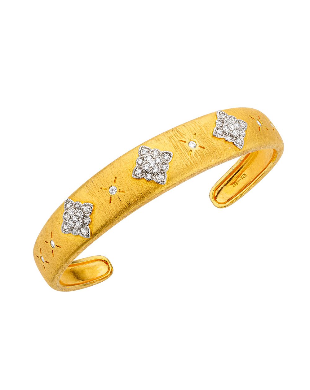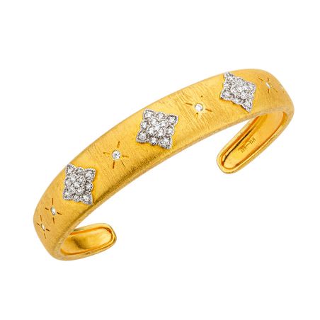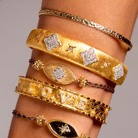 De Mira Cuff armband van Mya Bay combineert glans en verfijning in een tijdloze creatie. Deze verfijnde armband, gemaakt van 24-karaats verguld messing, is versierd met sprankelende sterren bezet met zirkonia, symbolen van licht en elegantie. Het geborstelde goudeffect voegt een kostbare, getextureerde touch toe en accentueert elk detail.