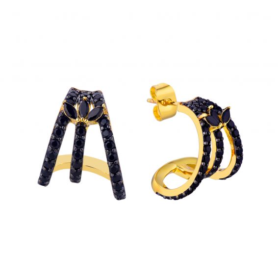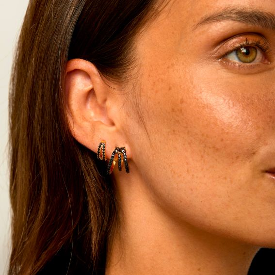 De Black Malia- oorbellen van MYA BAY tonen een gedurfde esthetiek waarbij de intensiteit van zwarte stenen samenkomt met de warmte van vergulding. Met een diameter van 17 mm hebben deze vernieuwde oorringen een compact maar opvallend silhouet, versterkt door een pavézetting van zwarte zirkonia's die diepte, contrast en een moderne touch toevoegen.