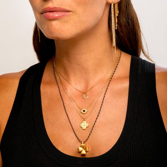 Dit vergulde sieraad, zowel mystiek als elegant, speelt met contrasten en creëert zo een diepe en moderne uitstraling. De delicate vergulde ketting accentueert de hanger perfect, waardoor een vrouwelijke en trendy ketting ontstaat die je alleen of in laagjes kunt dragen.