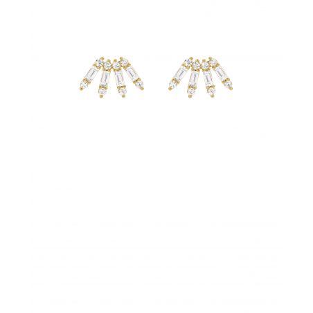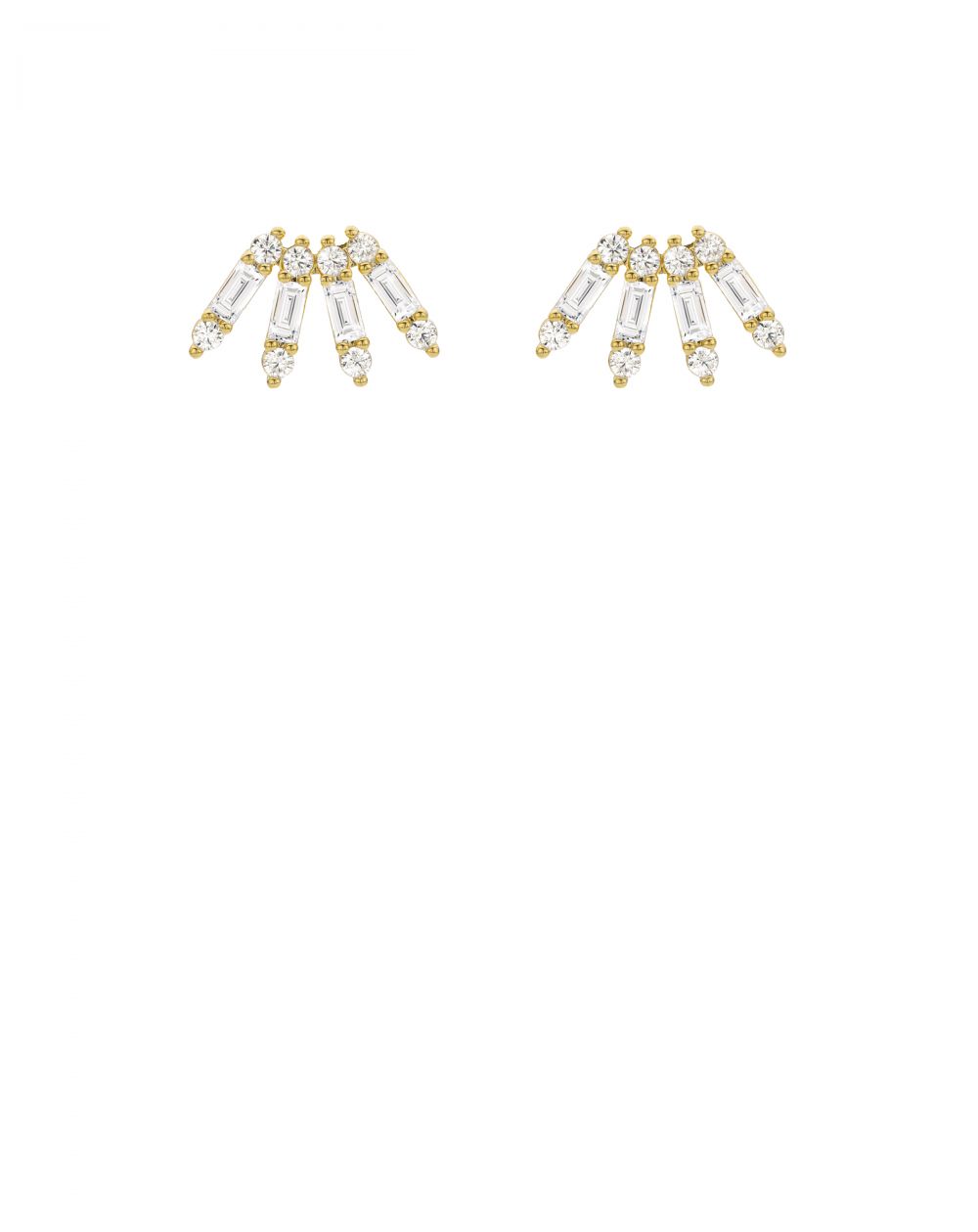 De VENTAGLIO- oorringen van MYA—BAY stralen een verfijnde schittering uit, geïnspireerd op de delicate vorm van een waaier. Het grafische ontwerp combineert ronde zirkonen en baguettegeslepen stenen om een subtiel en geraffineerd samenspel van volume en licht te creëren.