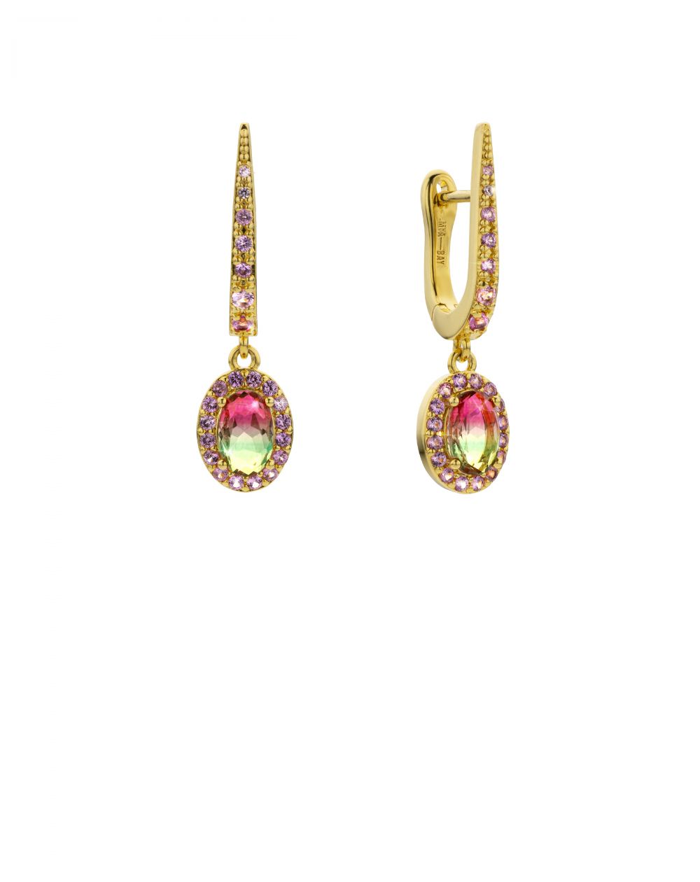 De delicate gouden oorring, subtiel bezet met roze zirkonen, draagt een ovale hanger met een centrale steen in "watermeloen"-tinten – een stralende kleurovergang van intens roze naar levendig groen. Een halo van roze zirkonen omringt de steen en benadrukt de schittering ervan.