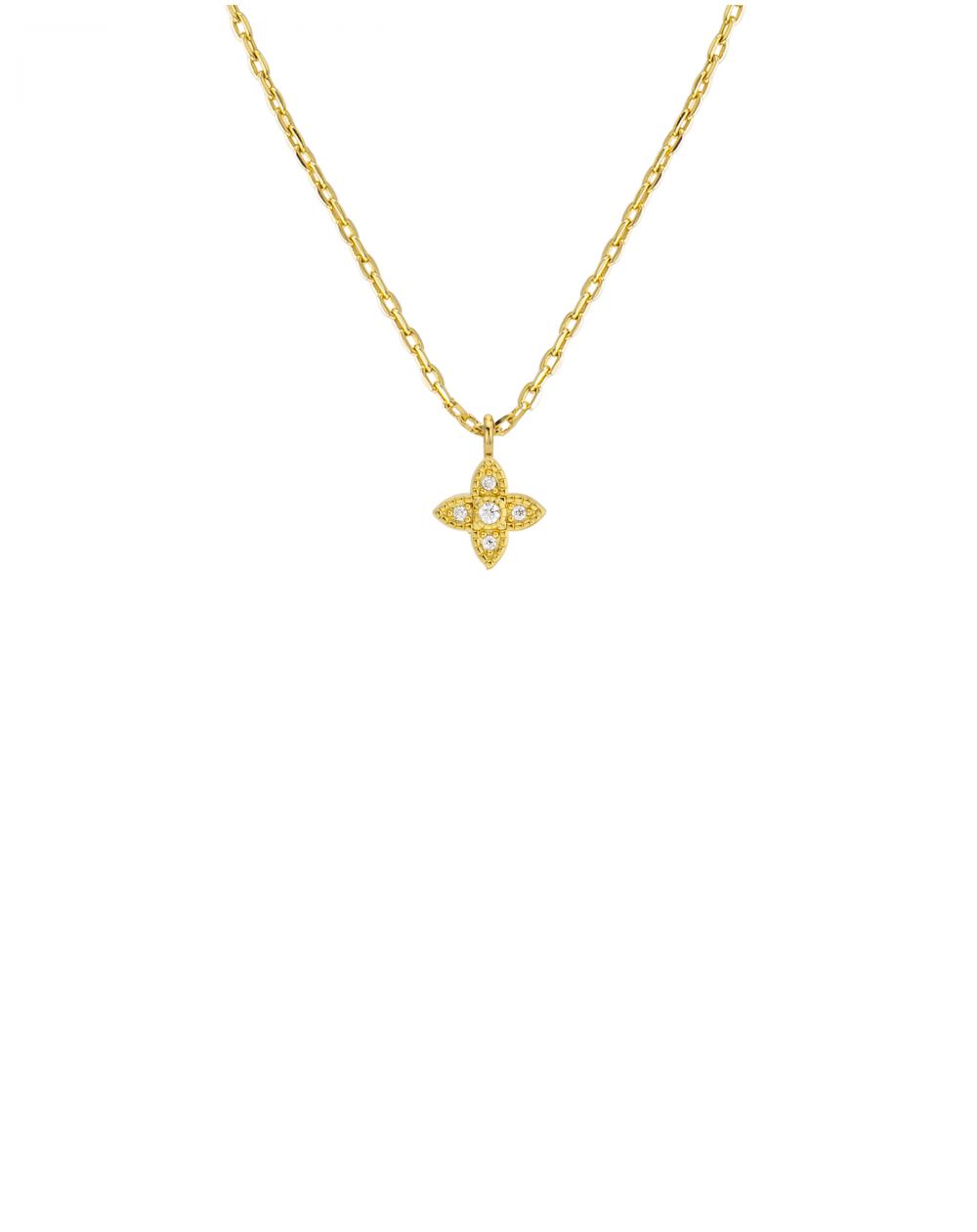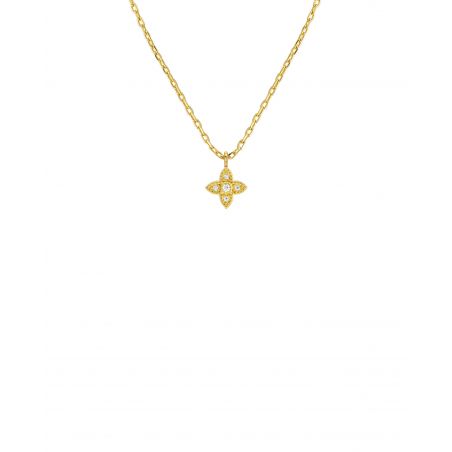 De bloemvormige hanger, subtiel bezet met fonkelende zirkonen, vangt het licht op een delicate manier. Aan een elegante gouden ketting hangt de hanger zachtjes in de decolleté, voor een look die zowel vrouwelijk als tijdloos is.