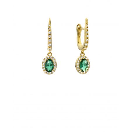 De ring bestaat uit een delicate ring bezet met fonkelende zirkonen en houdt een ovale hanger vast met een intens groene steen, omringd door een stralende halo van witte zirkonen. Dit contrast tussen de klassieke structuur en de levendige kleur creëert een elegant, gedurfd en uitgesproken vrouwelijk sieraad.