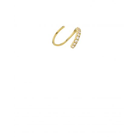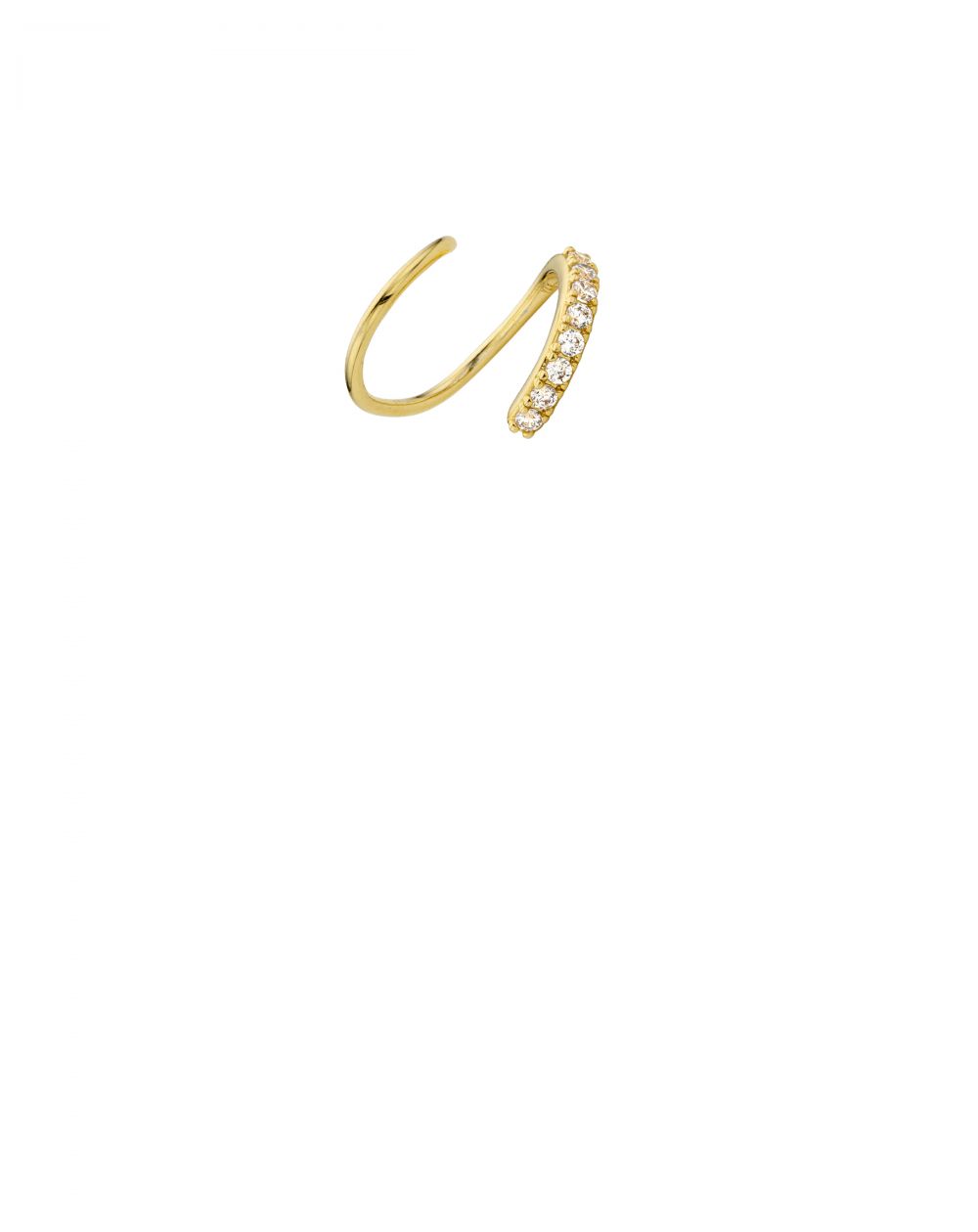 Het open, zacht gebogen ontwerp sluit elegant aan op het oor. Een gladde, minimalistische voorkant contrasteert met een zijkant bezet met fonkelende zirkonen, waardoor een subtiel samenspel ontstaat tussen schittering en ingetogen elegantie. Dit dubbele effect geeft karakter en moderniteit aan een bewust slank en grafisch silhouet.