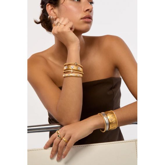 Groter en dikker dan andere modellen in de collectie, is deze geborstelde gouden manchetarmband een elegante blikvanger om de pols. Het ontwerp wordt gekenmerkt door verschillende ovale medaillons bezet met witte zirkonen, omgeven door een delicate pavé-halo die zorgt voor extra glans en diepte.