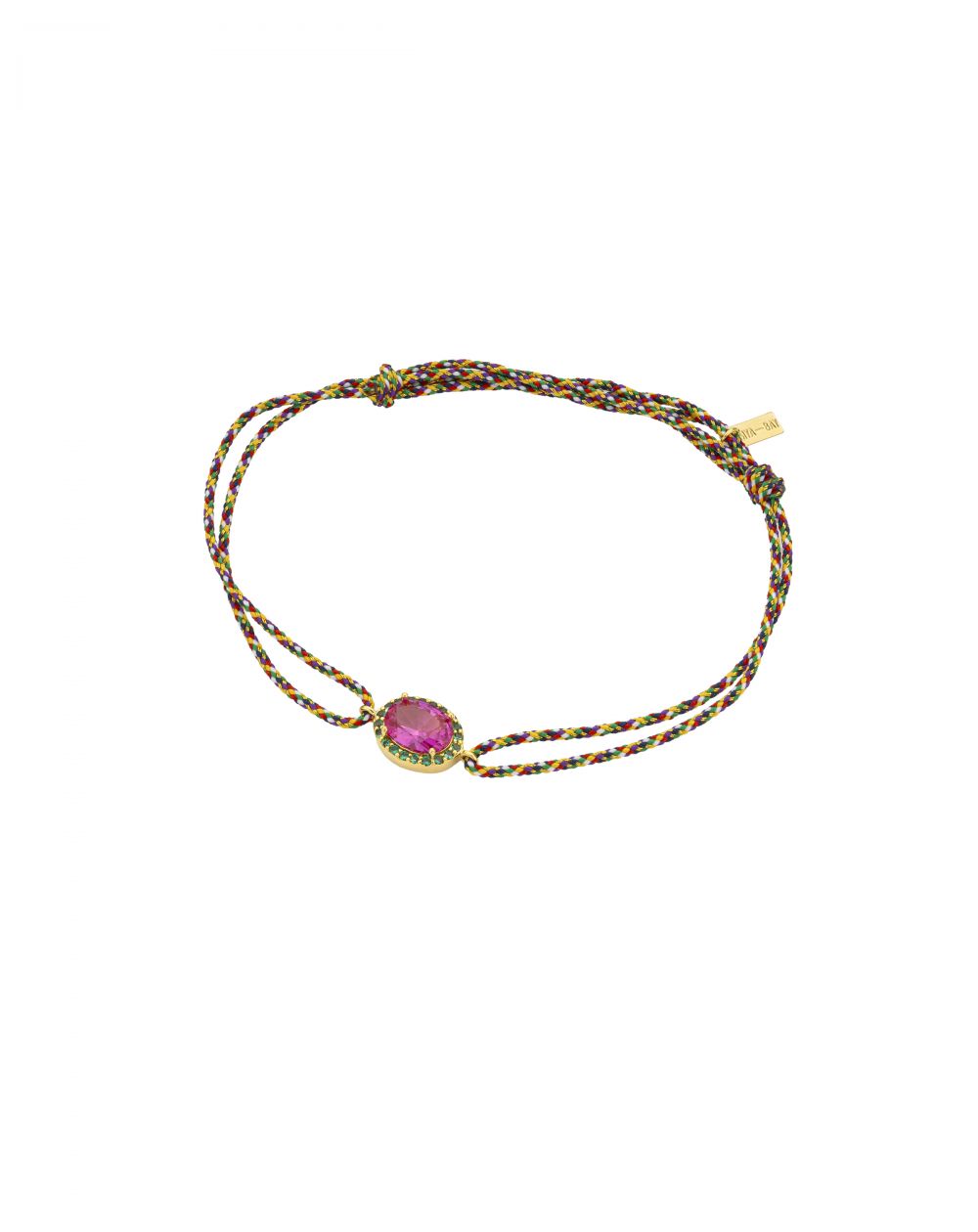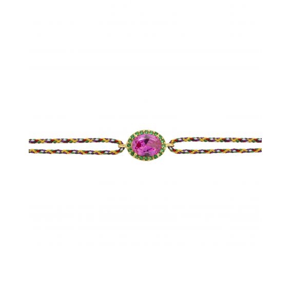 In het midden bevindt zich een intens fuchsia ovale steen, subtiel omringd door een halo van lichtgevende groene zirkonen, wat een gedurfd en zeer aantrekkelijk contrast creëert. Dit iconische Dynasty-motief, geïnspireerd op vintage sieraden, geeft een kleurrijke en eigentijdse draai aan klassieke ontwerpen.