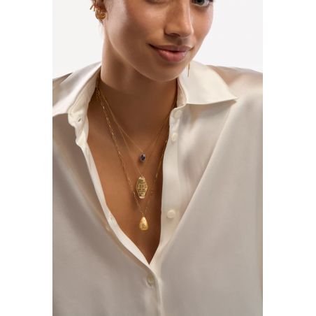 Gemonteerd aan een ketting met rechthoekige schakels in een kenmerkende stijl, combineert het karakter en verfijning in een perfect uitgebalanceerd geheel.