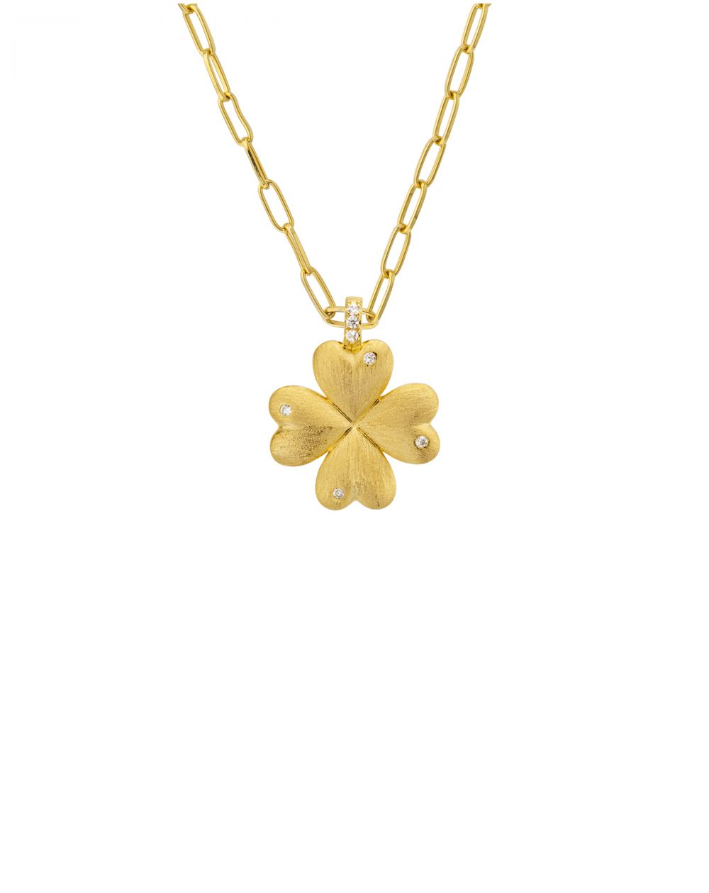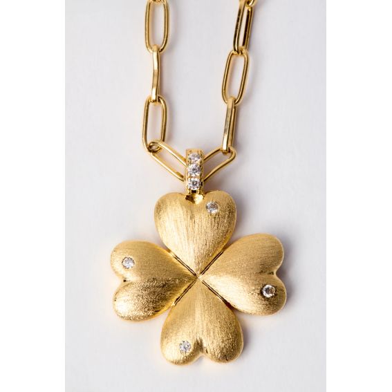 De gouden hanger heeft de iconische vintage vorm, met de kenmerkende gegraveerde lijnen, en draagt de onomwonden boodschap uit: