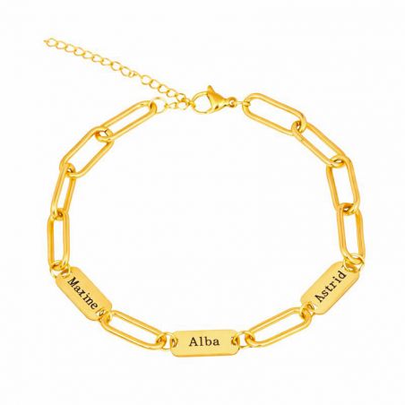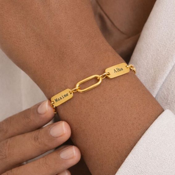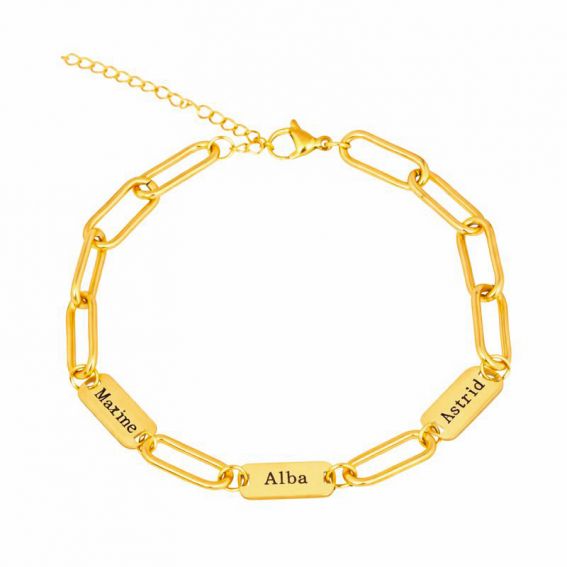 Deze armband, vervaardigd uit roestvrij staal , combineert elegantie, robuustheid en duurzaamheid. Verkrijgbaar in verguld of verzilverd staal, biedt hij een schitterende glans en uitstekende weerstand tegen dagelijkse slijtage. De moderne schakelketting voegt een eigentijdse touch toe en laat de gegraveerde plaatjes perfect uitkomen.
