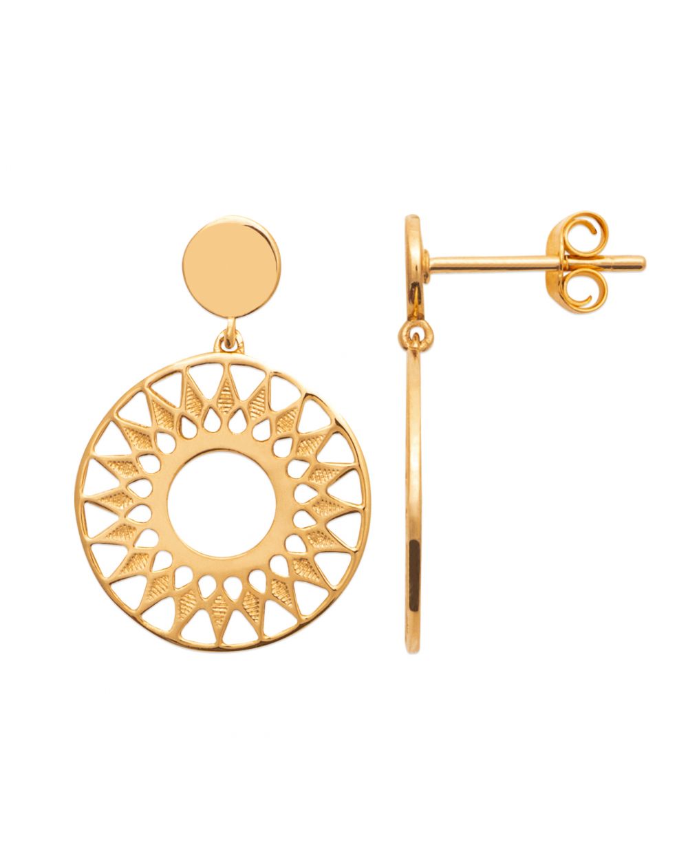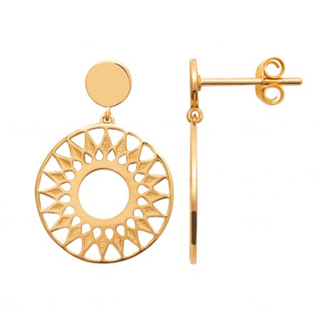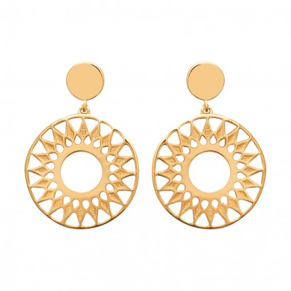 Deze 18 karaats vergulde oorbellen van hoge kwaliteit zijn boren gevormd door een gouden geperforeerde schijf in de vorm van de zon en hangen aan een kleine schijf.