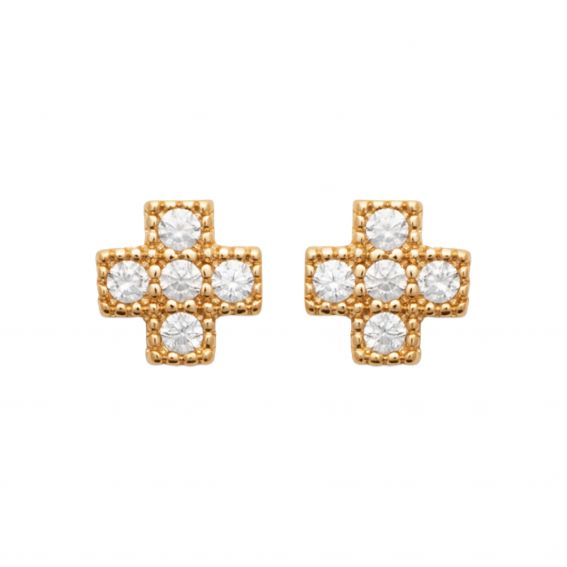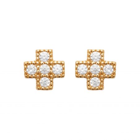 Deze fijne vergulde oorbellen in de vorm van een kruis met vier pootjes onderscheiden zich door hun elegantie en schittering. Elk kruis is bezet met lichtgevende zirkonen , voor een subtiele glans, elke dag weer.