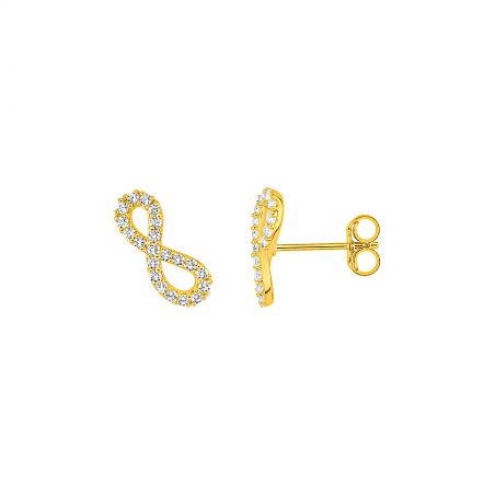 Deze 9 karaat gouden oorbellen zijn oneindige boren ingesteld met zirkoniumoxidestenen.