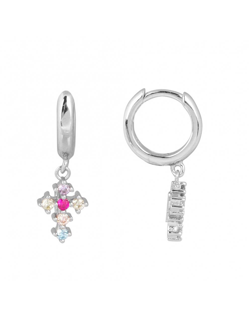 Deze 925 zilveren oorbellen zijn creolen voor dames met een kruis met kleine veelkleurige steentjes.