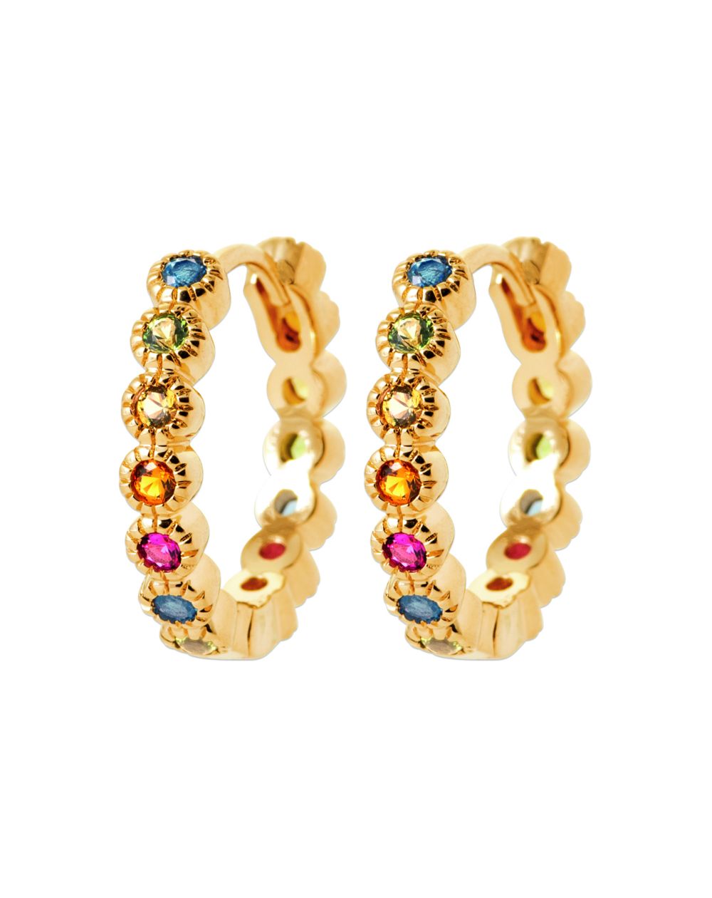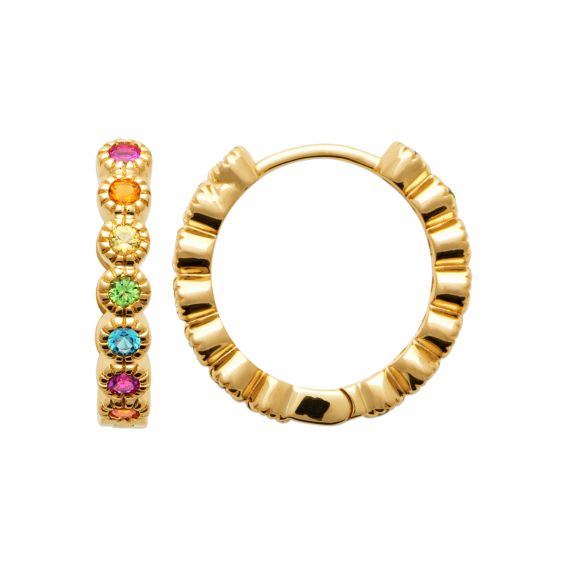 Deze 18 karaat vergulde oorbellen zijn creolen met veelkleurige stenen.