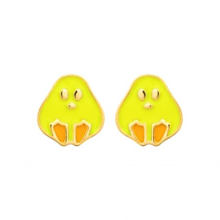 Deze 18 karaat vergulde oorbel is een boor met een geëmailleerd kuikentje