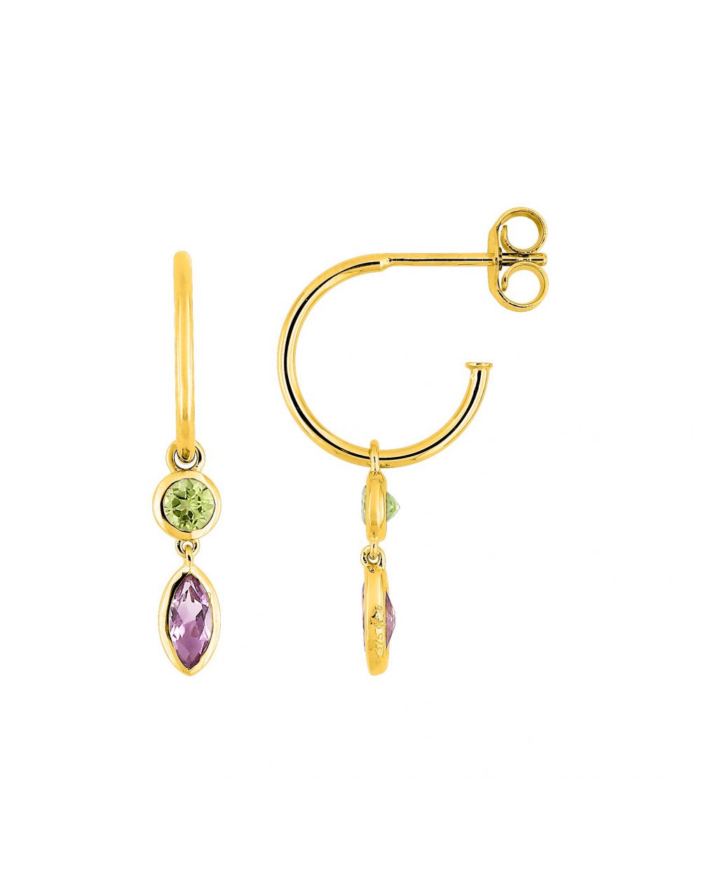 Deze 9 karaat gouden oorbellen zijn oorringen met twee bungelende steentjes, een ronde peridoot en een amethistblad
