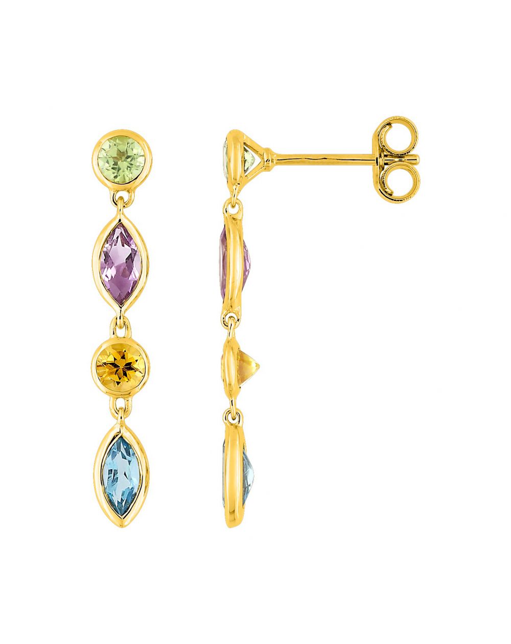 2 ronde stenen en bladvormige stenen, deze stenen zijn peridoot, amethist, citrien en topaas.