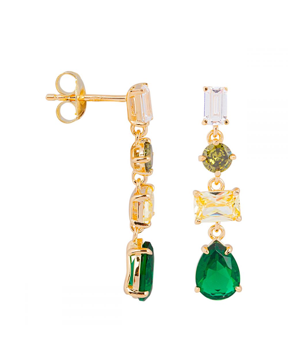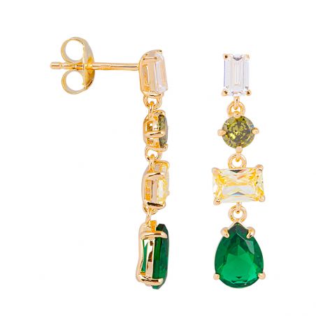 Deze 925 zilveren oorbellen zijn voorzien van citrien-, kristal- en smaragdkleurige stenen.
