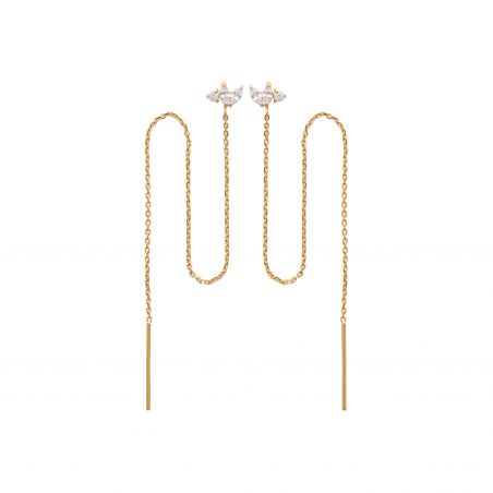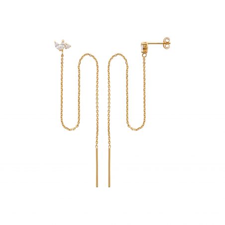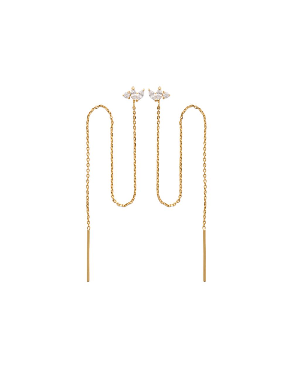 Vergulde oorbel, minimalistisch ontwerp met dun staafje en ketting, verfraaid met een sprankelende zirkoonboog.